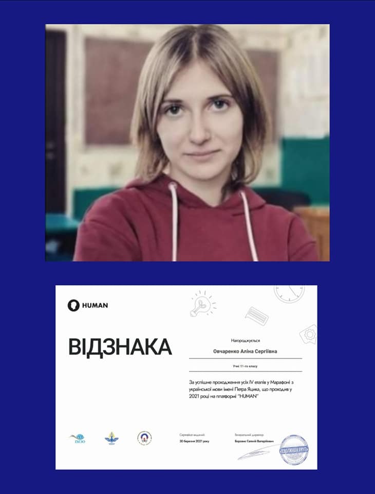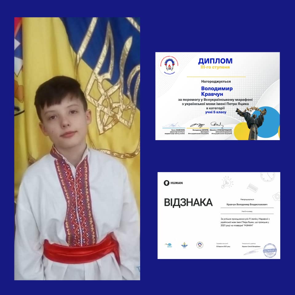 Вітаємо Володимира Кравчуна та Аліну Овчаренко з успішним завершенням першого цифрового Всеукраїнського марафону з української мови імені Петра Яцика, який тривав з 26 лютого до 21 березня. За успішне проходження всіх IV етапів та гідне представлення закладу освіти на всеукраїнському рівні учні отримали іменні відзнаки. А Володимир Кравчун нагороджений дипломом переможця ІІІ ступеня в категорії «Учні 5 класу». Вітаємо й бажаємо нових звершень!