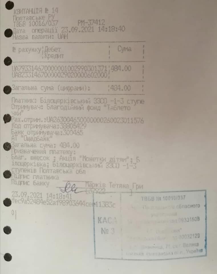 Найефективніший спосіб прищепити дітям справжні цінності – залучати їх до проєктів, які їм під силу та які змінюють світ. Протягом вересня благодійний фонд «Таблеточки» за ініціативи Національного банку України та підтримки Міністерства освіти і науки України проводив всеукраїнську благодійну акцію «Монетки дітям» на підтримку онкохворих дітей. Білоцерківський заклад освіти приєднався до проведення акції. Упродовж двох тижнів, з 7 по 21 вересня, діти збирали монети номіналом у 25 копійок, щоб потім перерахувати їх у благодійний фонд «Таблеточки». Чимало мешканців села, громади, району підтримали учнів у їх прагненні допомогти онкохворим дітям, щиро дякуємо за це! Кожна така монета – це крок назустріч здоровому дитинству. Спільними зусиллями було зібрано й перераховано 484 грн. Найактивнішими виявилися учні 6 класу, тож вони нагороджені екскурсійною поїздкою. На другому місці – четвертокласники, на третьому – колектив учнів 8 класу. Проте головне – не перемога й призові місця, а відчуття сили єднання заради досягнення мети.